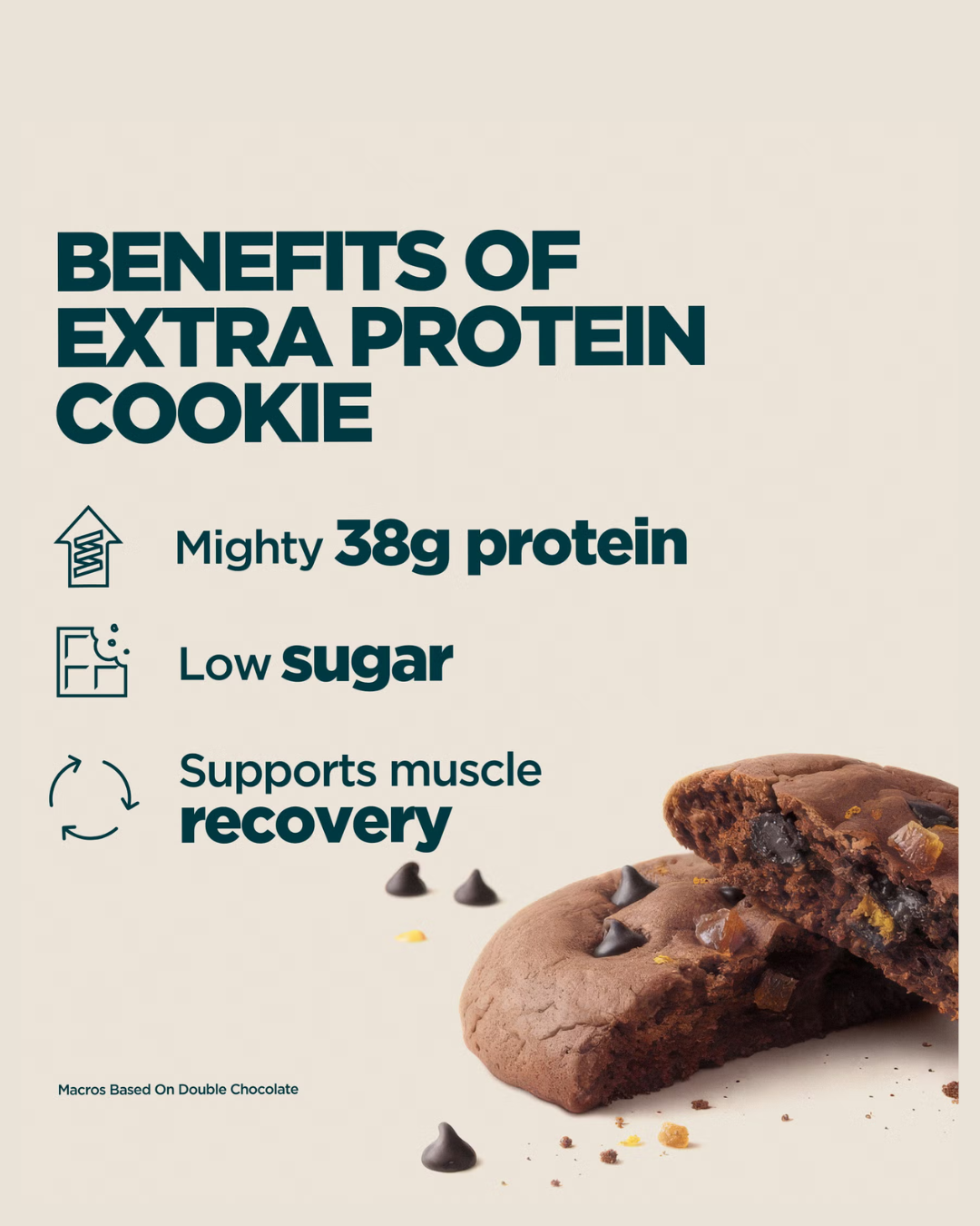 Το Extra Cookie μας είναι ένα σνακ υψηλής περιεκτικότητας σε πρωτεΐνη που προσφέρει 38 γρ. πρωτεΐνης σε κάθε μερίδα — ιδανικό για την υποστήριξη της συντήρησης και αποκατάστασης των μυών.¹
